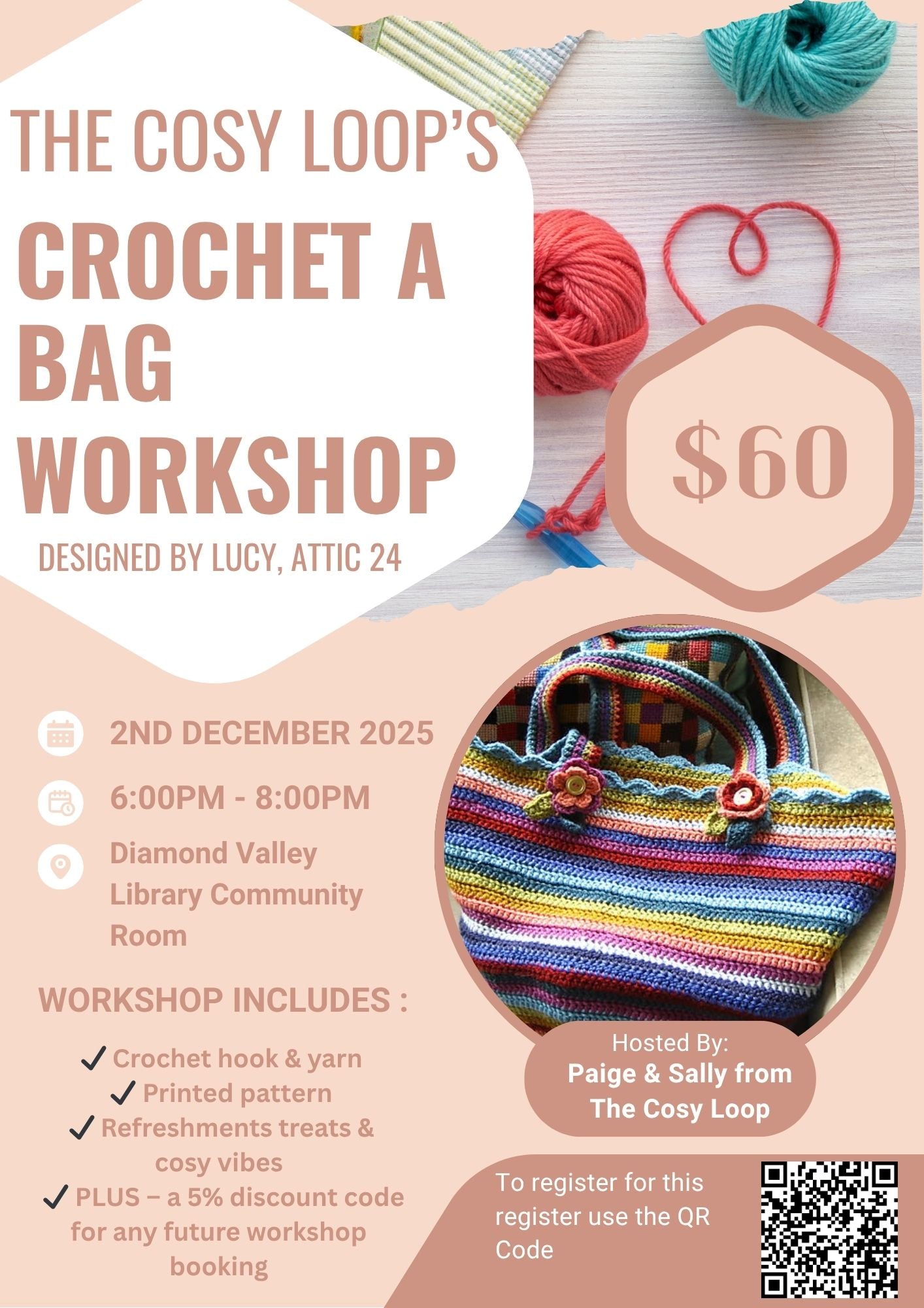 Our Final Cosy Loop Workshop for the Year! We’re finishing 2025 with something truly special — a beautiful crochet bag designed by one of our favourites, Lucy from Attic24 (UK)! Join us for our last workshop of the year — a fun, relaxed session filled with colour, creativity and great company. Whether you’ve been part of our coaster workshop, our cosy Crafter-noons, this is the perfect way to wrap up the year with something handmade and heartwarming. Spots are limited — so grab your hook and join us for a joyful afternoon before the festive rush begins!